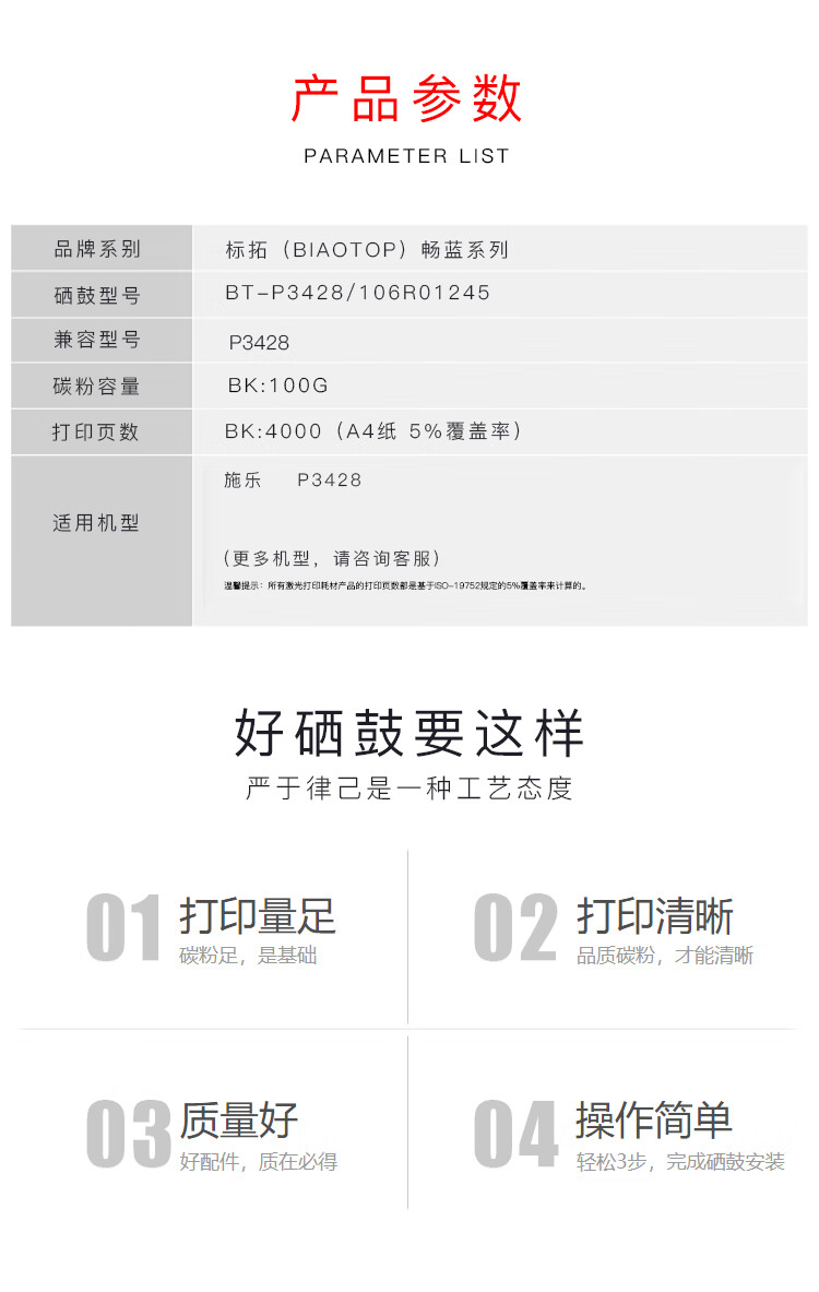 | 产品名称 : | 标拓 (Biaotop) P3428/106R01245硒鼓适用施乐P3428打印机 畅蓝系列 |