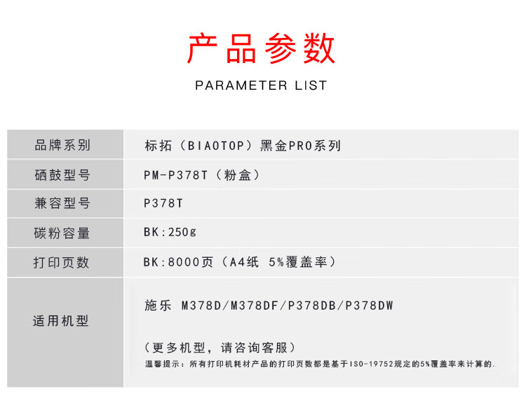 > 办公耗材 复印纸 硒鼓 > 打印耗材 > 硒鼓 > 标拓 (Biaotop) P378T大容量粉盒适用施乐M378D/M378DF/P378DB/P378DW打印机 Pro+MAX版| 产品名称 : | 标拓 (Biaotop) P378T大容量粉盒适用施乐M378D/M378DF/P378DB/P378DW打印机 Pro+MAX版 |
