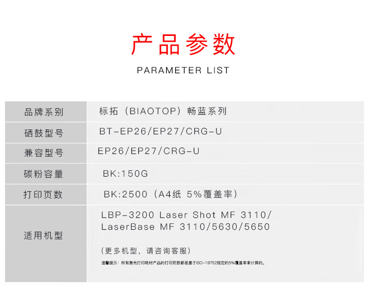> 办公耗材 复印纸 硒鼓 > 打印耗材 > 硒鼓 > 标拓 (Biaotop) EP26/EP27/CRG-U硒鼓适用MF3110/3112/3220/3222/5650/570/5750/5770/5700打印机 畅蓝系列| 产品名称 : | 标拓 (Biaotop) EP26/EP27/CRG-U硒鼓适用MF3110/3112/3220/3222/5650/570/5750/5770/5700打印机 畅蓝系列 |