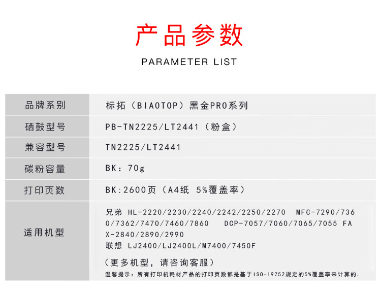 | 产品名称 : | 标拓 (Biaotop) TN2225粉盒适用兄弟2240D/2250DN/7360/7470D打印机 Pro+MAX版 |