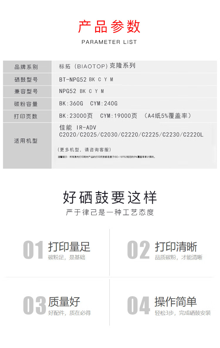 | 产品名称 : | 标拓 (Biaotop) NPG52蓝色粉盒适用佳能C2020/2220/2225/2230复印机 |