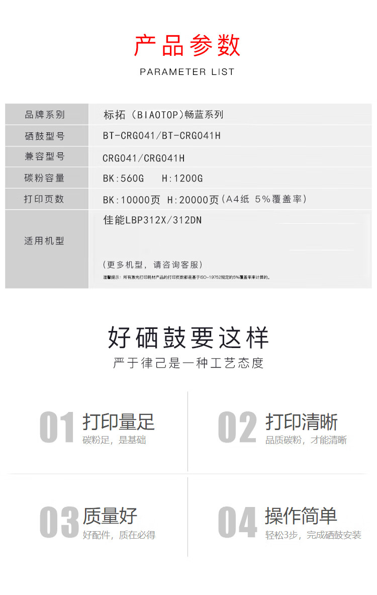 | 产品名称 : | 标拓 (Biaotop) CRG041硒鼓适用佳能LBP312x/312dn 打印机 畅蓝系列 |