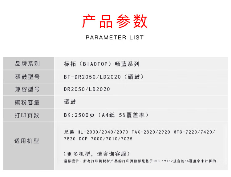 > 办公耗材 复印纸 硒鼓 > 打印耗材 > 硒鼓 > 标拓 (Biaotop) DR2050/LD2020硒鼓架适用兄弟HL-2030/2040/2070/2820/2920/7220/7420/7820打印机 畅蓝系列| 产品名称 : | 标拓 (Biaotop) DR2050/LD2020硒鼓架适用兄弟HL-2030/2040/2070/2820/2920/7220/7420/7820打印机 畅蓝系列 |