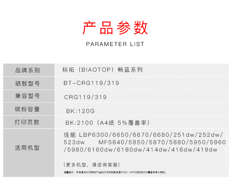 > 办公耗材 复印纸 硒鼓 > 打印耗材 > 硒鼓 > 标拓 (Biaotop) CRG119/319硒鼓适用佳能LBP6300/6650/6670/MF5840/5850/5870/5880打印机 畅蓝系列| 产品名称 : | 标拓 (Biaotop) CRG119/319硒鼓适用佳能LBP6300/6650/6670/MF5840/5850/5870/5880打印机 畅蓝系列 |