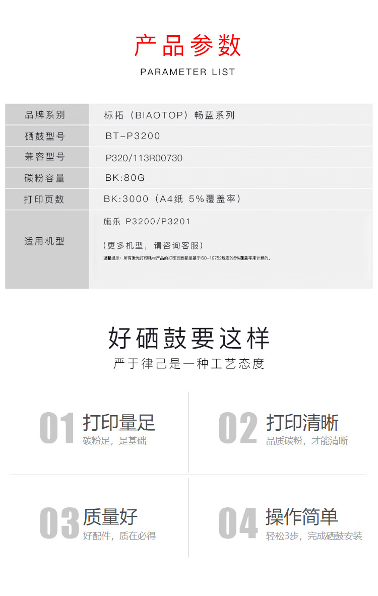 | 产品名称 : | 标拓 (Biaotop) P3200易加粉硒鼓适用施乐P3200/P3201打印机 畅蓝系列 |