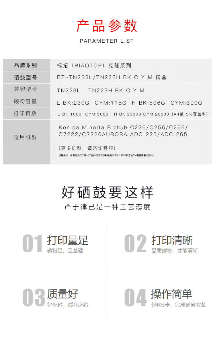 > 办公耗材 复印纸 硒鼓 > 打印耗材 > 硒鼓 > 标拓 (Biaotop) TN223大容量版黄色粉盒适用柯美Bizhub C226/C256/C266/C7222/C7226复印机 克隆系列| 产品名称 : | 标拓 (Biaotop) TN223大容量版黄色粉盒适用柯美Bizhub C226/C256/C266/C7222/C7226复印机 克隆系列 |
