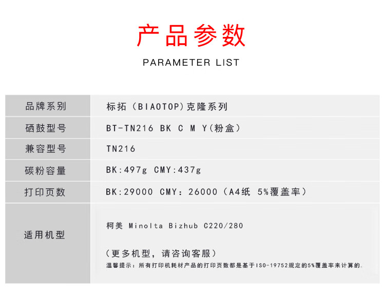 > 办公耗材 复印纸 硒鼓 > 打印耗材 > 硒鼓 > 标拓 (Biaotop) TN216蓝色墨粉筒适用柯美bizhub C220/C280/C360/C7722/C7728复印机 克隆系列| 产品名称 : | 标拓 (Biaotop) TN216蓝色墨粉筒适用柯美bizhub C220/C280/C360/C7722/C7728复印机 克隆系列 |