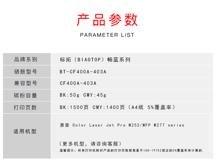 产品名称 : 标拓 (Biaotop) CF401A蓝色硒鼓适用HPCOLOR LASER JET PRO 201A M252N M277N M277DW 红色经典系列