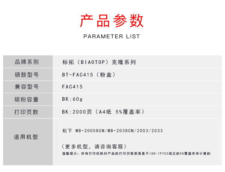 > 办公耗材 复印纸 硒鼓 > 打印耗材 > 硒鼓 > 标拓 (Biaotop) FAC415墨粉盒适用松下MB-2008CN/MB-2038CN/2003/2033复印机 克隆系列| 产品名称 : | 标拓 (Biaotop) FAC415墨粉盒适用松下MB-2008CN/MB-2038CN/2003/2033复印机 克隆系列 |