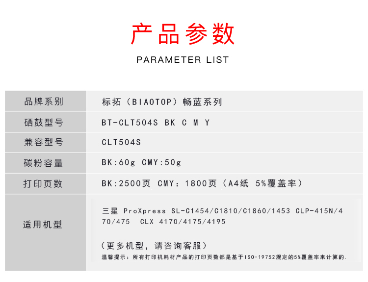 > 办公耗材 复印纸 硒鼓 > 打印耗材 > 硒鼓 > 标拓 (Biaotop) CLT 504S蓝色硒鼓适用三星C1454/C1810/C1860/1453/415N/470/4170/4175/4195打印机 畅蓝系列| 产品名称 : | 标拓 (Biaotop) CLT 504S蓝色硒鼓适用三星C1454/C1810/C1860/1453/415N/470/4170/4175/4195打印机 畅蓝系列 |