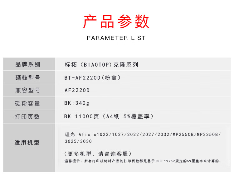 > 办公耗材 复印纸 硒鼓 > 打印耗材 > 硒鼓 > 标拓 (Biaotop) AF2220D墨粉筒适用理光Aficio 1022/1027/1032/2022/2027/2032/3025/3030复印机 克隆系列| 产品名称 : | 标拓 (Biaotop) AF2220D墨粉筒适用理光Aficio 1022/1027/1032/2022/2027/2032/3025/3030复印机 克隆系列 |