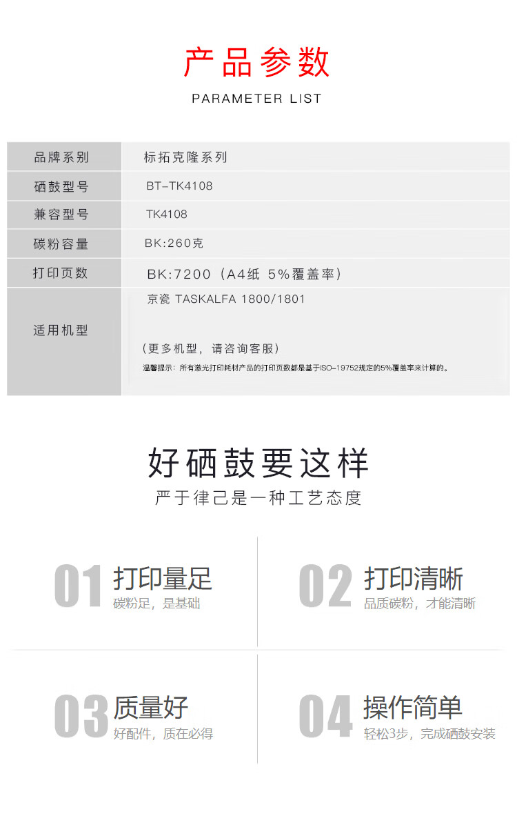 | 产品名称 : | 标拓 (Biaotop) TK4108墨粉盒适用京瓷TASKalfa1800/1801打印机 克隆系列 |