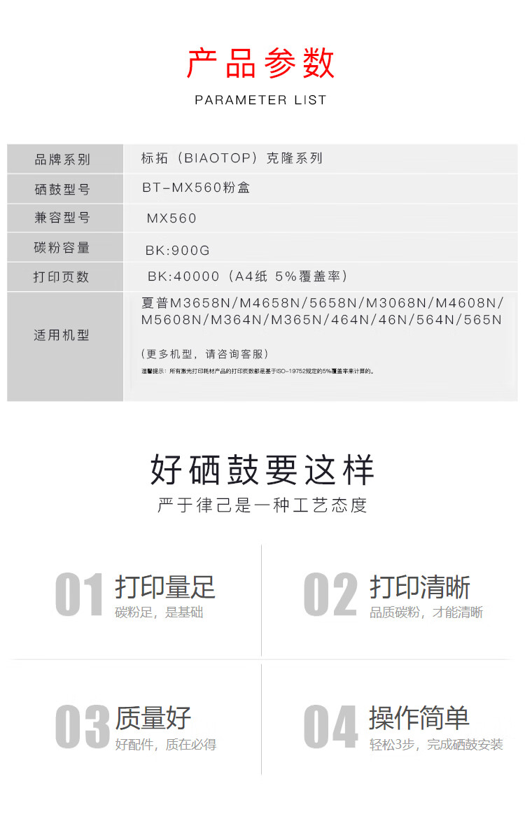 > 办公耗材 复印纸 硒鼓 > 打印耗材 > 硒鼓 > 标拓 (Biaotop) MX560CT墨粉盒适用夏普M3658N/M4658N/5658N/M3068N/M4608N/M5608N/M364N复印机 克隆系列| 产品名称 : | 标拓 (Biaotop) MX560CT墨粉盒适用夏普M3658N/M4658N/5658N/M3068N/M4608N/M5608N/M364N复印机 克隆系列 |