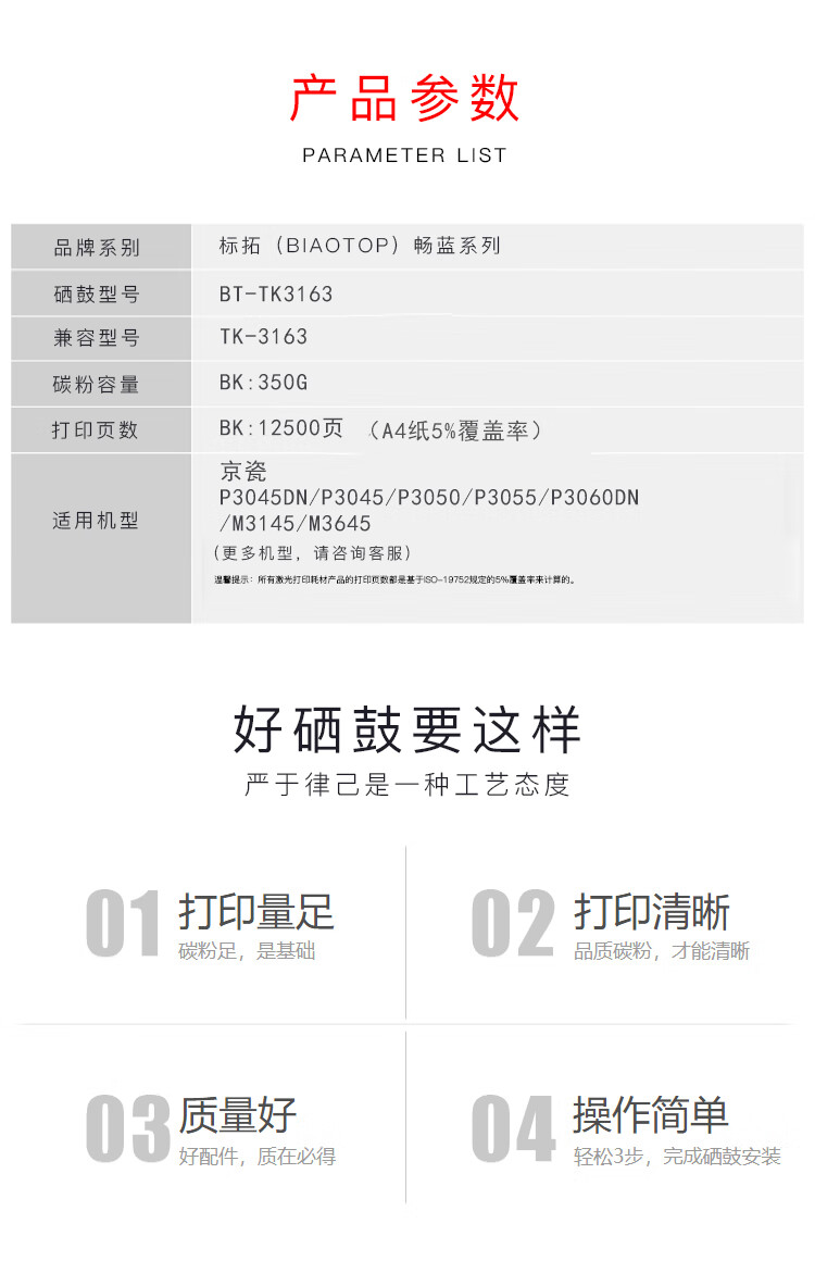| 产品名称 : | 标拓 (Biaotop) TK3163粉盒适用京瓷ECOSYS P3045dn打印机 |