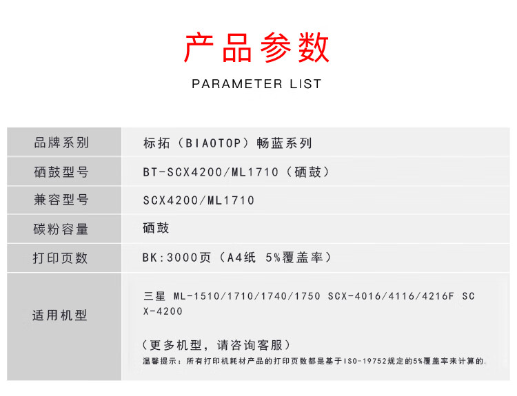 > 办公耗材 复印纸 硒鼓 > 打印耗材 > 硒鼓 > 标拓 (Biaotop) SCX4200/ML1710硒鼓适用三星ML-1510/1710/1740/1750 SCX-4016/4116SCX-4200打印机 畅蓝系列| 产品名称 : | 标拓 (Biaotop) SCX4200/ML1710硒鼓适用三星ML-1510/1710/1740/1750 SCX-4016/4116SCX-4200打印机 畅蓝系列 |