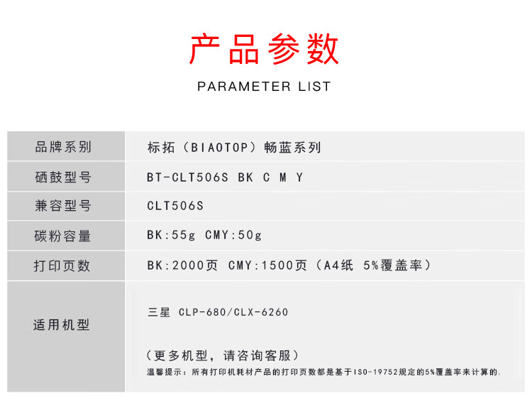 | 产品名称 : | 标拓 (Biaotop) CLT 506S黑色硒鼓适用三星CLP-680/CLX-6260打印机 畅蓝系列 |