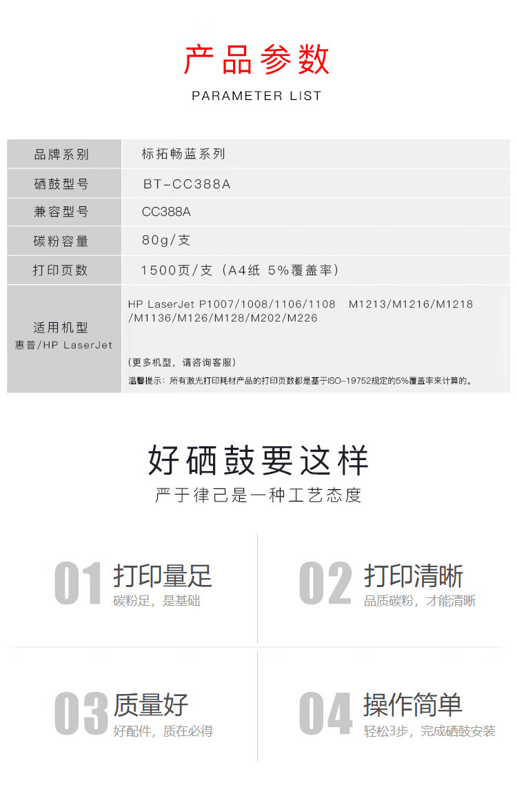 产品名称 : 标拓 (Biaotop) CC388A硒鼓适用惠普M1136 p1108 m1216nfh m126nwm打印机 红色经典系列