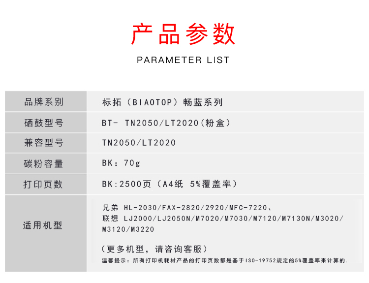 > 办公耗材 复印纸 硒鼓 > 打印耗材 > 硒鼓 > 标拓 (Biaotop) TN2050/LT2020黑色粉盒适用兄弟2030/FAX-2820/2920/7220联想2000/M7020打印机 畅蓝系列| 产品名称 : | 标拓 (Biaotop) TN2050/LT2020黑色粉盒适用兄弟2030/FAX-2820/2920/7220联想2000/M7020打印机 畅蓝系列 |