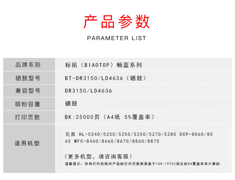 > 办公耗材 复印纸 硒鼓 > 打印耗材 > 硒鼓 > 标拓 (Biaotop) DR3150/LD4636硒鼓架适用兄弟HL-5240/5250/5280/DCP-8060/8065/8460/8660打印机 畅蓝系列| 产品名称 : | 标拓 (Biaotop) DR3150/LD4636硒鼓架适用兄弟HL-5240/5250/5280/DCP-8060/8065/8460/8660打印机 畅蓝系列 |