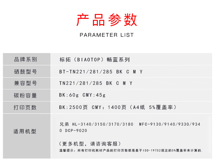 > 办公耗材 复印纸 硒鼓 > 打印耗材 > 硒鼓 > 标拓 (Biaotop) TN221/281/285蓝色粉盒适用兄弟3140/3150/3170CDW/DCP9020/MFC9130/9140打印机 畅蓝系列| 产品名称 : | 标拓 (Biaotop) TN221/281/285蓝色粉盒适用兄弟3140/3150/3170CDW/DCP9020/MFC9130/9140打印机 畅蓝系列 |