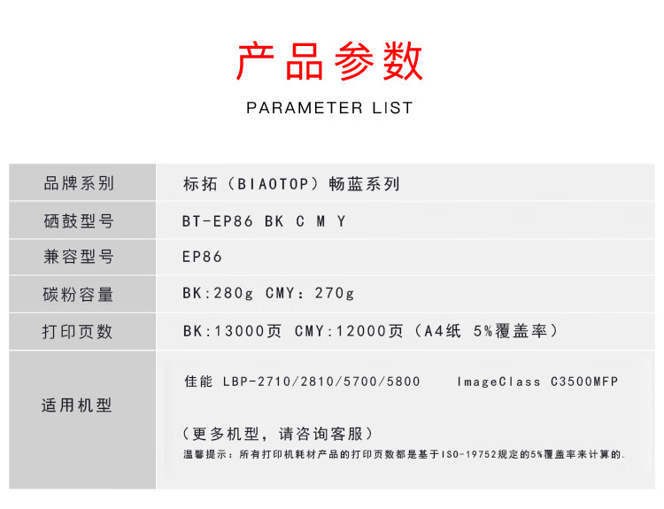 > 办公耗材 复印纸 硒鼓 > 打印耗材 > 硒鼓 > 标拓 (Biaotop) EP86红色硒鼓适用佳能LBP-2710/2810/5700/5800/ImageClass C3500MFP打印机 畅蓝系列| 产品名称 : | 标拓 (Biaotop) EP86红色硒鼓适用佳能LBP-2710/2810/5700/5800/ImageClass C3500MFP打印机 畅蓝系列 |