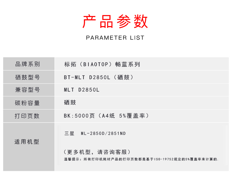 | 产品名称 : | 标拓 (Biaotop) MLT D2850L易加粉硒鼓适用三星ML-2850ND打印机 畅蓝系列 |