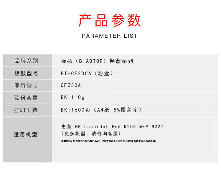 > 办公耗材 复印纸 硒鼓 > 打印耗材 > 硒鼓 > 标拓 (Biaotop) CF230A粉盒适用惠普HP LaserJet Pro M203 MFP M227打印机 畅蓝系列| 产品名称 : | 标拓 (Biaotop) CF230A粉盒适用惠普HP LaserJet Pro M203 MFP M227打印机 畅蓝系列 |
