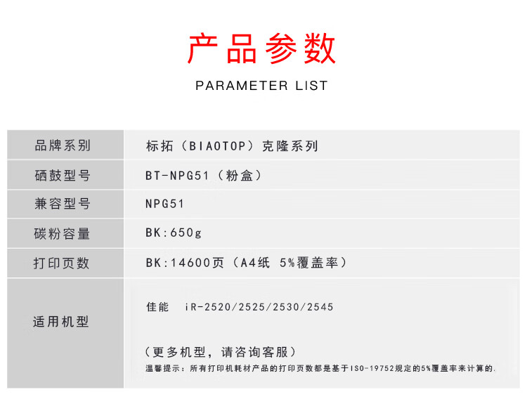 | 产品名称 : | 标拓 (Biaotop) NPG51黑色粉盒适用佳能iR-2520/2525/2530/2545复印机 克隆系列 |
