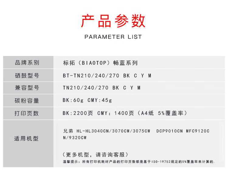 > 办公耗材 复印纸 硒鼓 > 打印耗材 > 硒鼓 > 标拓 (Biaotop) TN210/240/270黑色粉盒适用兄弟HL3040CN 3070 9120CN 9320CW打印机 畅蓝系列| 产品名称 : | 标拓 (Biaotop) TN210/240/270黑色粉盒适用兄弟HL3040CN 3070 9120CN 9320CW打印机 畅蓝系列 |