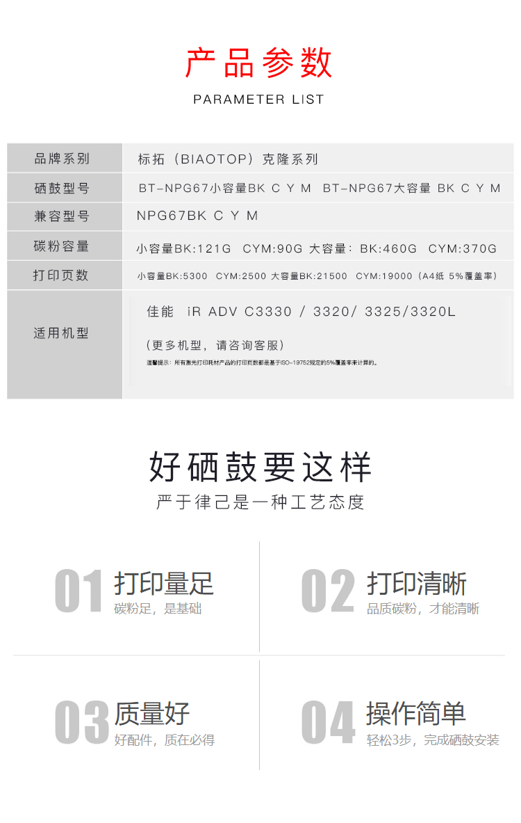 > 办公耗材 复印纸 硒鼓 > 打印耗材 > 硒鼓 > 标拓 (Biaotop) NPG67小容量红色墨粉盒适用佳能IR-ADV C3325/C3320/C3300/C3330复印机 克隆系列| 产品名称 : | 标拓 (Biaotop) NPG67小容量红色墨粉盒适用佳能IR-ADV C3325/C3320/C3300/C3330复印机 克隆系列 |