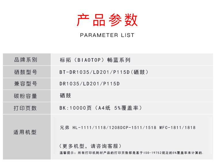 > 办公耗材 复印纸 硒鼓 > 打印耗材 > 硒鼓 > 标拓 (Biaotop) DR1035/LD201/P115D硒鼓架适用兄弟HL-1111/1118/1208/1511/1518/1811/1818打印机 畅蓝系列| 产品名称 : | 标拓 (Biaotop) DR1035/LD201/P115D硒鼓架适用兄弟HL-1111/1118/1208/1511/1518/1811/1818打印机 畅蓝系列 |