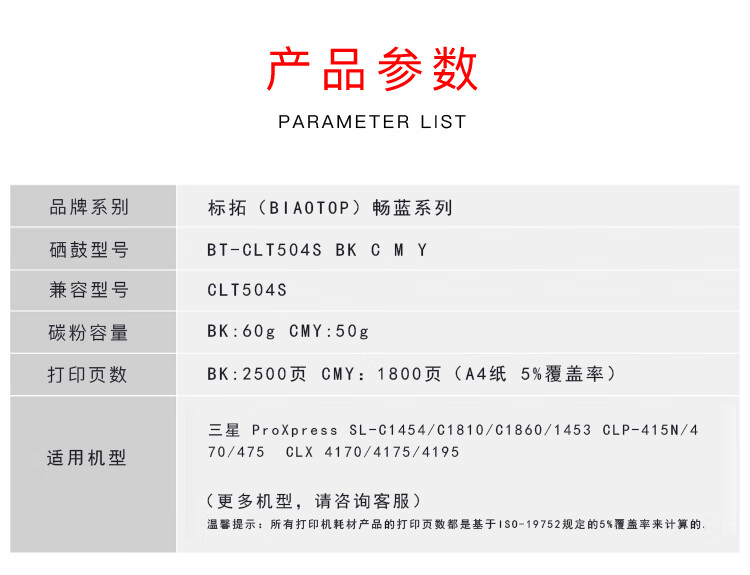 > 办公耗材 复印纸 硒鼓 > 打印耗材 > 硒鼓 > 标拓 (Biaotop) CLT 504S红色硒鼓适用三星C1454/C1810/C1860 415N/470/475 4170/4175/4195打印机 畅蓝系列| 产品名称 : | 标拓 (Biaotop) CLT 504S红色硒鼓适用三星C1454/C1810/C1860 415N/470/475 4170/4175/4195打印机 畅蓝系列 |