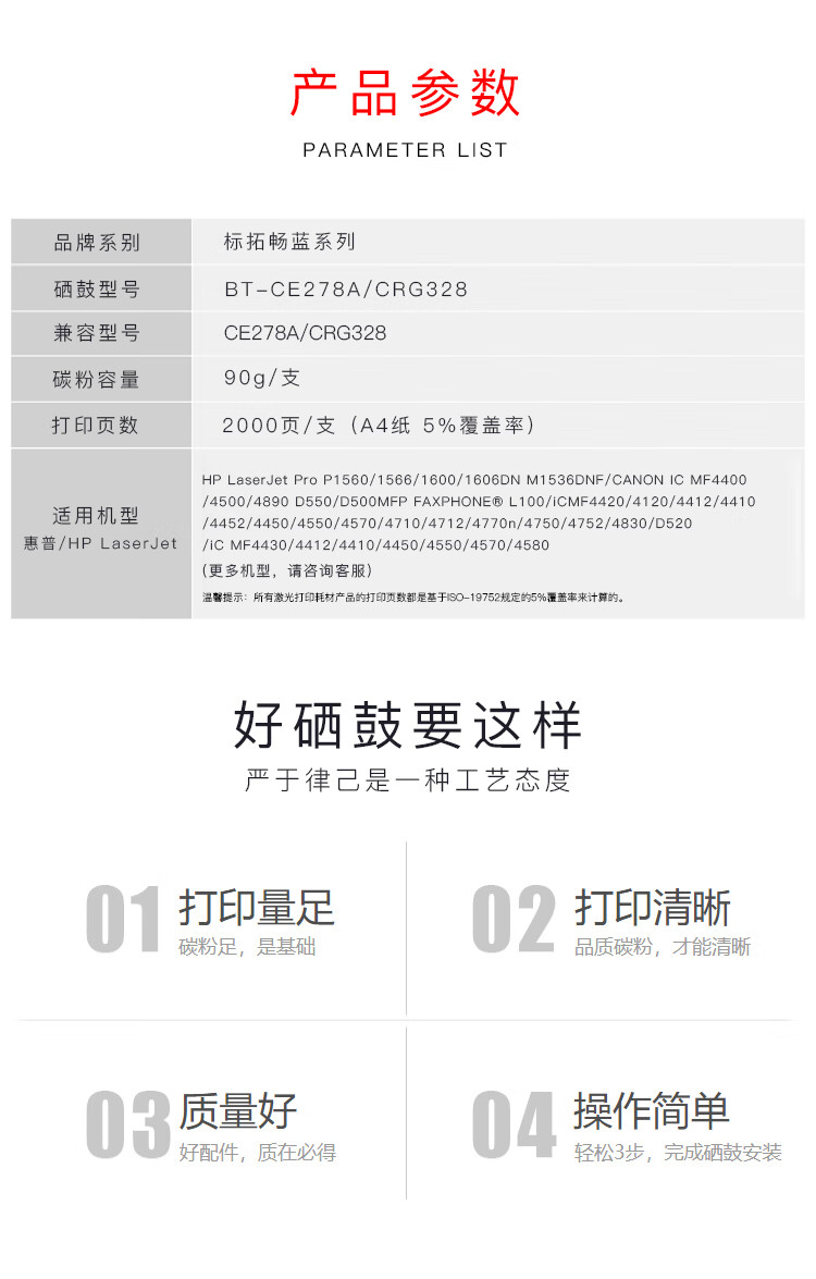 > 办公耗材 复印纸 硒鼓 > 打印耗材 > 硒鼓 > 标拓 (Biaotop) CE278A/CRG328硒鼓适用佳能MF4712/4752 LBP6230DN/L150打印机 畅蓝系列| 产品名称 : | 标拓 (Biaotop) CE278A/CRG328硒鼓适用佳能MF4712/4752 LBP6230DN/L150打印机 畅蓝系列 |