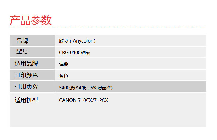 > 办公耗材 复印纸 硒鼓 > 打印耗材 > 硒鼓 > 欣彩硒鼓AR-CRG040C专业版 适用于:佳能CANON LBP712Cdn LBP712Cx LBP710Cx 打印页数:5400页| 产品名称 : | 欣彩硒鼓AR-CRG040C专业版 适用于:佳能CANON LBP712Cdn LBP712Cx LBP710Cx 打印页数:5400页 |