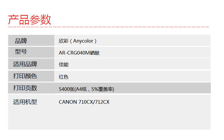 | 规格 | 专业版 适用于:佳能CANON LBP712Cdn LBP712Cx LBP710Cx 打印页数:5400页 | |