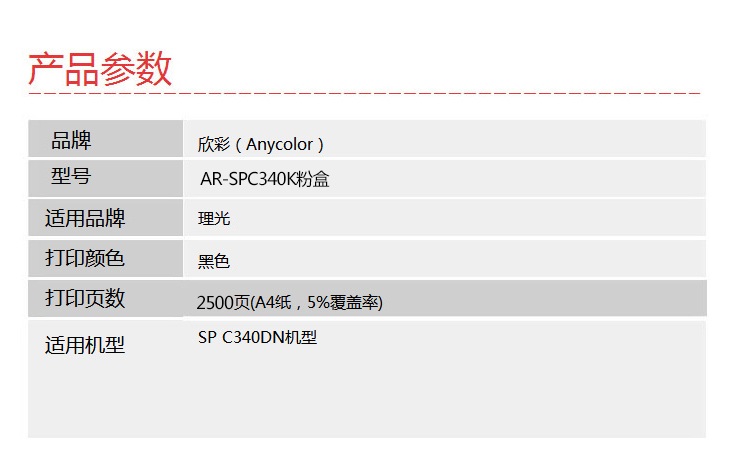 | 规格 | 专业版 适用于:理光SP C340DN 打印页数:2500页 | |