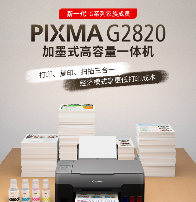 | 产品名称 : | 佳能(Canon)G2820大容量可加墨彩色多功能一体机(打印/复印/扫描/作业打印/照片打印机) |