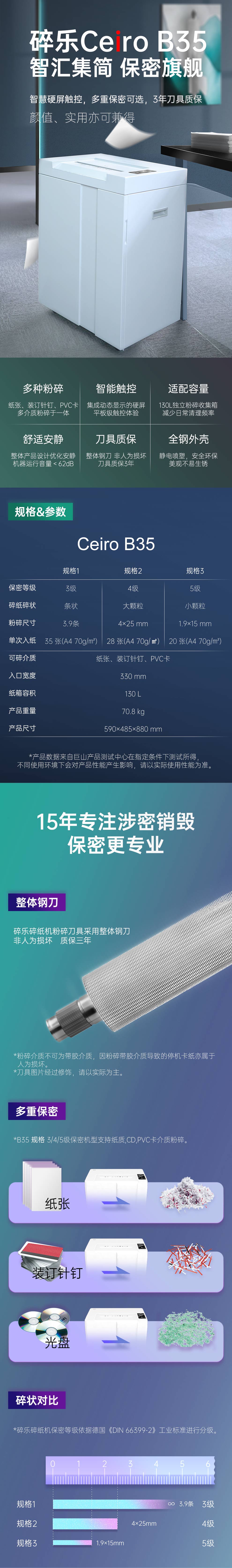 | 产品名称 : | 碎乐(Ceiro)B35碎纸机智能商务型机1.9*15mm颗粒5级保密,可碎纸、PVC卡、光盘 |