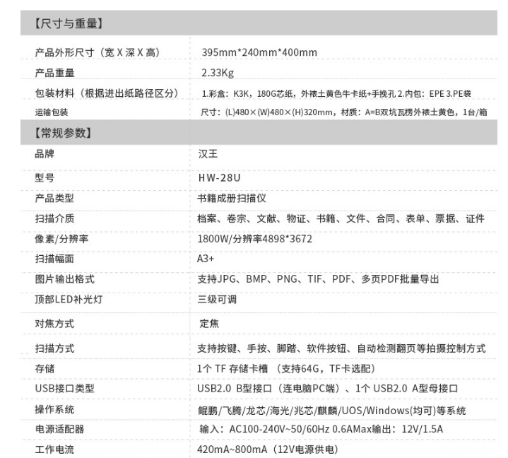 | 产品名称 : | 汉王(Hanvon)HW-28U高拍仪书籍成册 书刊 高清高速扫描仪1800万像素带屏幕A3幅面 高清高速教学商用办公 |