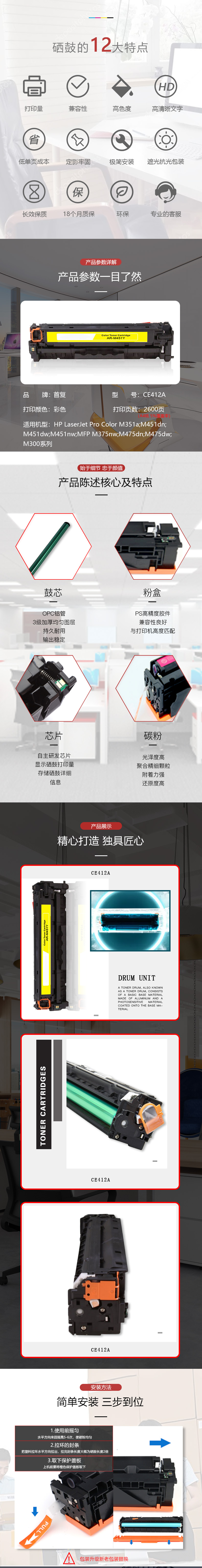 | 产品名称 : | 首复 CE412A 黄色硒鼓 305A 适用惠普HP M351a M451dn M451nw M375nw M475dn |