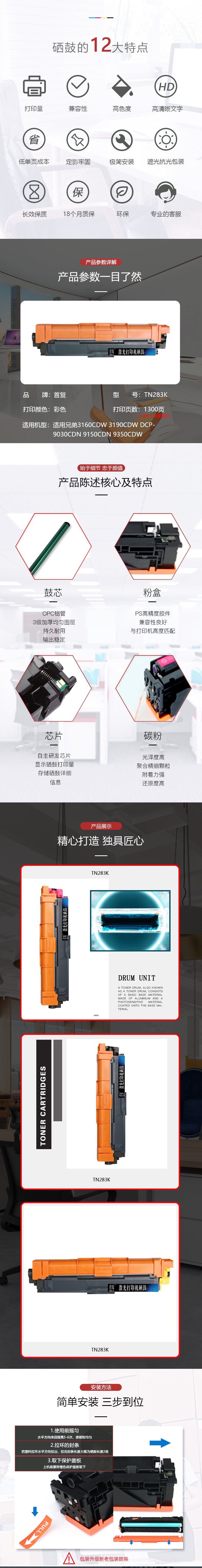 > 办公耗材 复印纸 硒鼓 > 打印耗材 > 墨盒 > 首复 TN283K 黑色粉盒 适用兄弟3160CDW 3190CDW DCP-9030CDN 9150CDN 9350CDW 打印机硒鼓| 产品名称 : | 首复 TN283K 黑色粉盒 适用兄弟3160CDW 3190CDW DCP-9030CDN 9150CDN 9350CDW 打印机硒鼓 |