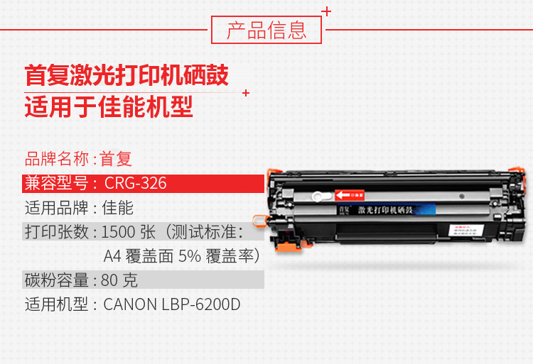 > 办公耗材 复印纸 硒鼓 > 打印耗材 > 硒鼓 > 首复CRG-326硒鼓 适用佳能Canon I-SENSYS LBP6200d 6230dw打印机墨盒6200d CRG-328惠普CE278A 78A| 产品名称 : | 首复CRG-326硒鼓 适用佳能Canon I-SENSYS LBP6200d 6230dw打印机墨盒6200d CRG-328惠普CE278A 78A |