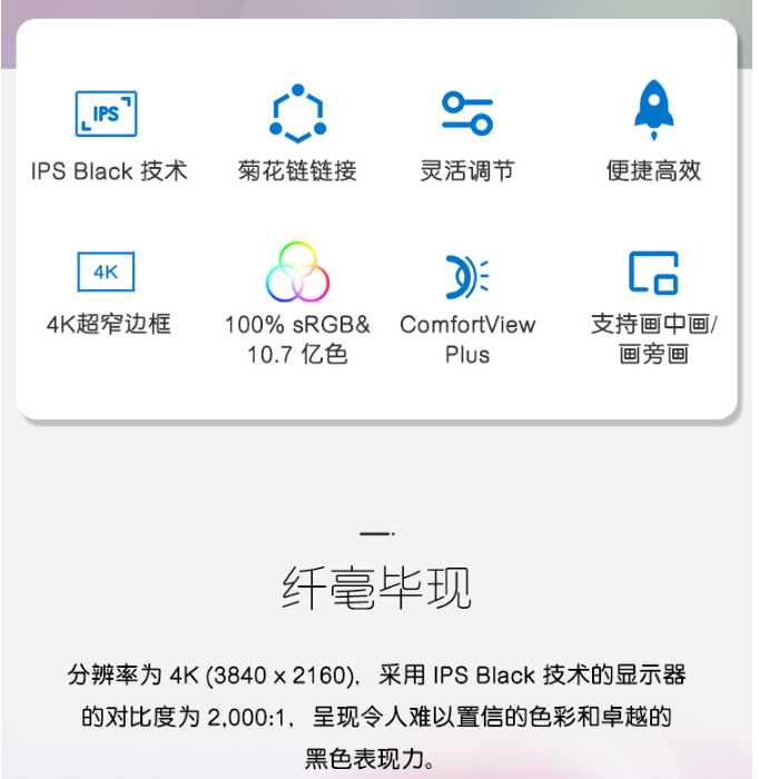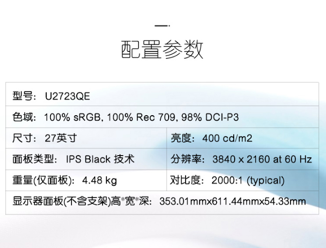 | 产品名称 : | 戴尔(DELL) 27英寸 4K超高清 IPS Black屏 HDR400 硬件低蓝光 Type-C 90W 电脑显示器 U2723QE |