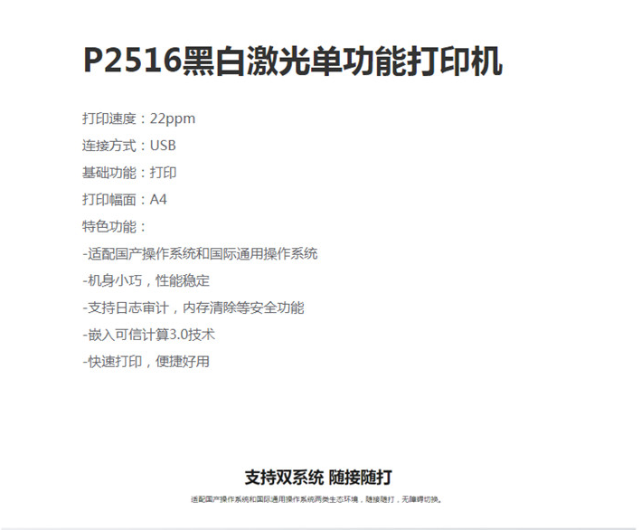 | 产品名称 : | 奔图(PANTUM)P2516 A4黑白激光单功能打印机 |