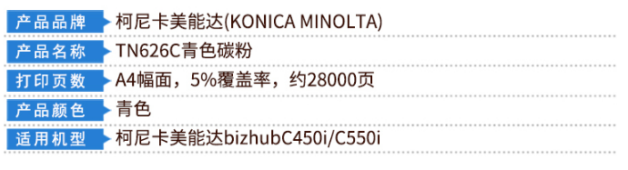 > 办公耗材 复印纸 硒鼓 > 打印耗材 > 墨粉 > 柯尼卡美能达 KONICA MINOLTA TN626C 原装墨粉 青色 约28000页(适用bizhub C450i/C550i机型)| 产品名称 : | 柯尼卡美能达 KONICA MINOLTA TN626C 原装墨粉 青色 约28000页(适用bizhub C450i/C550i机型) |