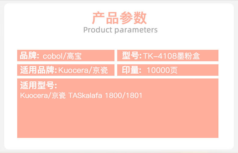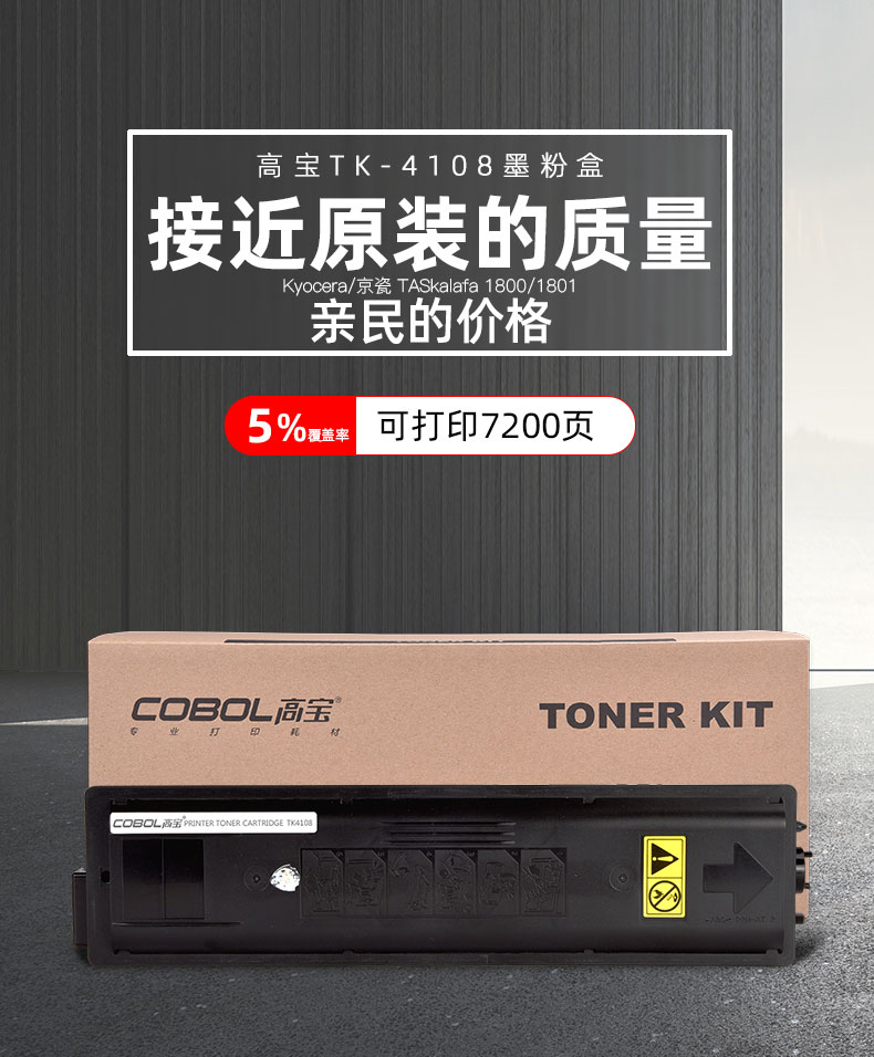 | 产品名称 : | 高宝 COBOL TK-4108 墨粉盒适用京瓷TASKalfa 1800 1801 2200 2201碳粉 |