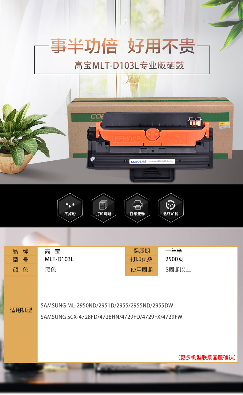 | 产品名称 : | 高宝(COBOL)MLT-D103L 专业版硒鼓 黑色三星2950ND/2951D/2955/2955ND/2955DW |