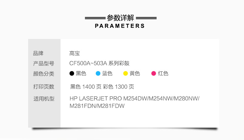 | 产品名称 : | 高宝CF503A标准版硒鼓红色适用惠普M254dw/M254nw/M280nw/M281fdn/M281fdw打印机 |