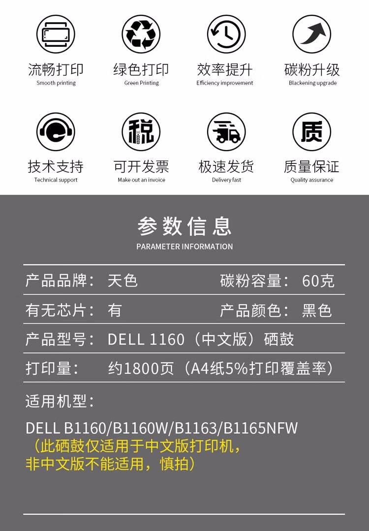 | 产品名称 : | 天色适用戴尔B1165nfw硒鼓B116X墨盒B1163;B1163W;B1160碳粉盒 DELL B1160易加版双支装 |