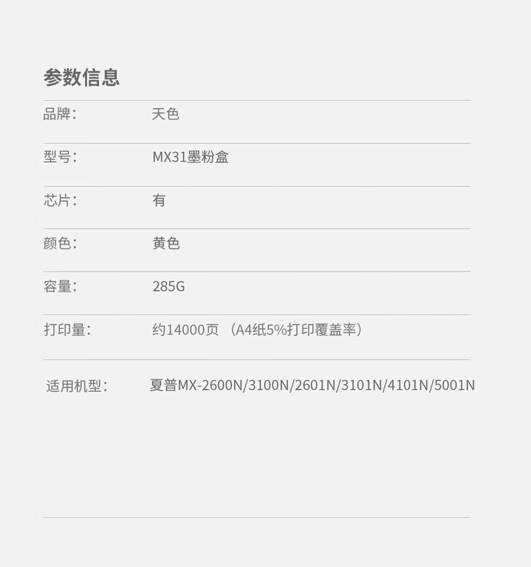产品名称 : 天色 粉盒 夏普MX31黄色Y (适用于SharpMX-2600N/3100N/2601N/3101N/4101N/5001N)阳光旗舰版